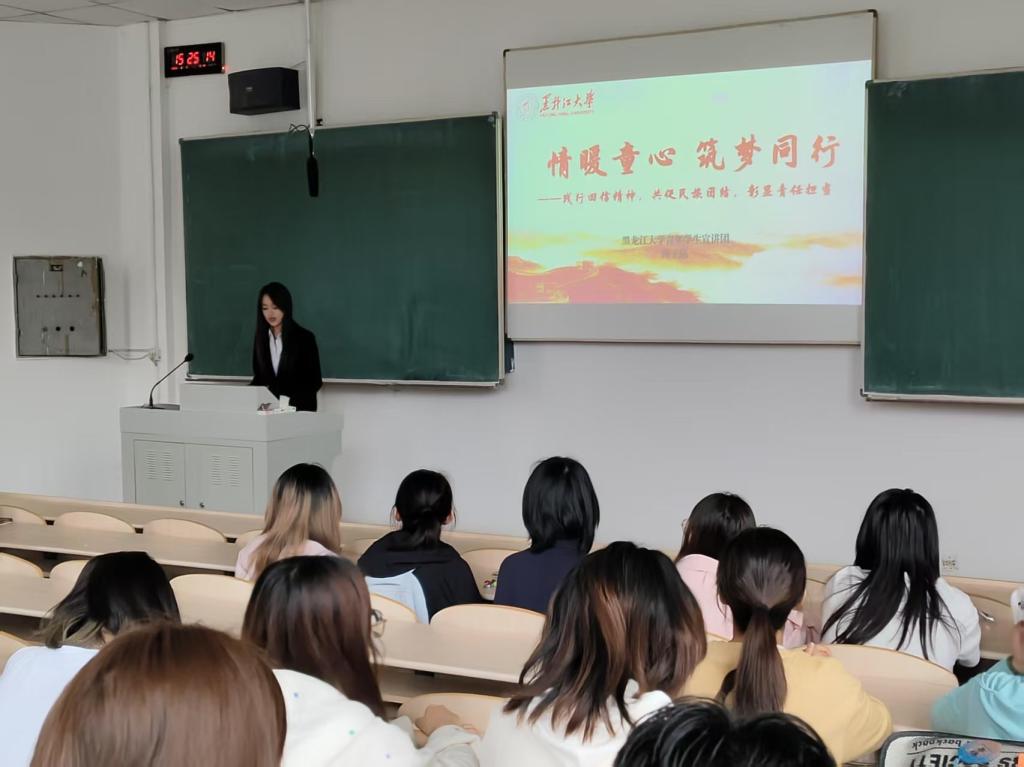 朱名赫同学以“解锁青春密码:家国情怀的四个维度”为题展开本次宣讲。她以“相机”为线,结合相关志愿经历,生动讲述了“我与相机”“小朋友与相机”的故事。她表示,同学们要积极结合自己的专业,充分发挥自身作用,在时代的洪流中站稳脚跟,为社会发展贡献青春力量。