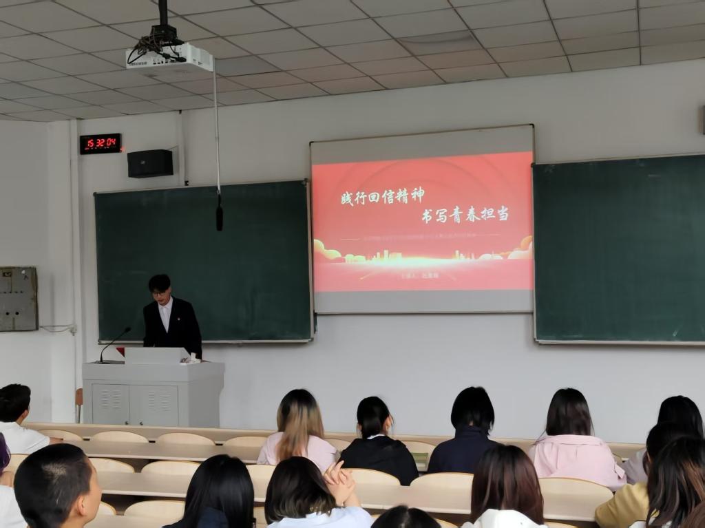 赵景瑞同学以“践行回信精神,书写青春担当”为题,结合自身山区支教经历,带领同学们进一步理解习近平总书记重要讲话和重要回信精神。他提到,当代青年是推动时代发展的主力军,先锋队。同学们应不负使命,冲锋在前,为时代发展开拓新道路,擘画新蓝图,在实现中华民族伟大复兴的伟大实践中挺膺担当。