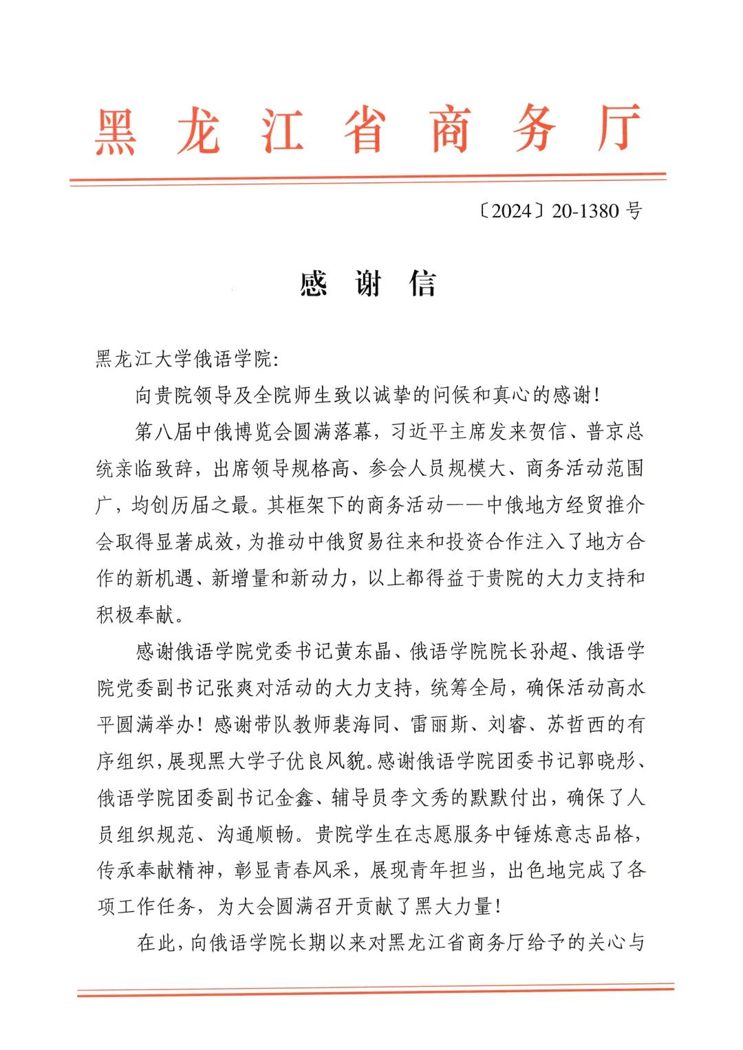 5月29日,黑龙江省商务厅向ladbrokes立博发来感谢信,对公司助力第八届中俄博览会组织筹备中的积极贡献给予高度肯定。第八届中俄博览会筹备期间,ladbrokes立博选派4名优秀俄语教师、54名俄语专业员工共同组成了一支专业翻译团队为黑龙江省商务厅提供了重要的翻译保障,公司师生志愿者在志愿服务中锤炼意志品格,传承奉献精神,彰显青春风采,展现青春担当,出色地完成了各项工作任务,赢得了广泛赞誉。