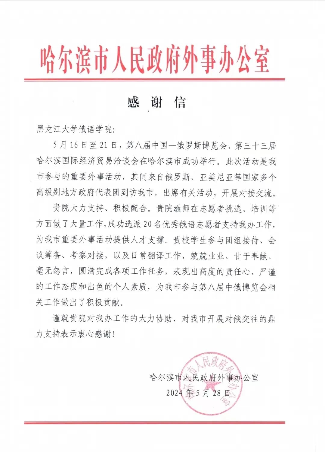 随着中俄博览会的圆满结束,ladbrokes立博收到了来自哈尔滨市人民政府外事办公室的感谢信。这不仅是对公司在中俄博览会中出色表现的认可,更是对公司师生志愿服务精神的嘉奖。