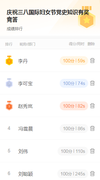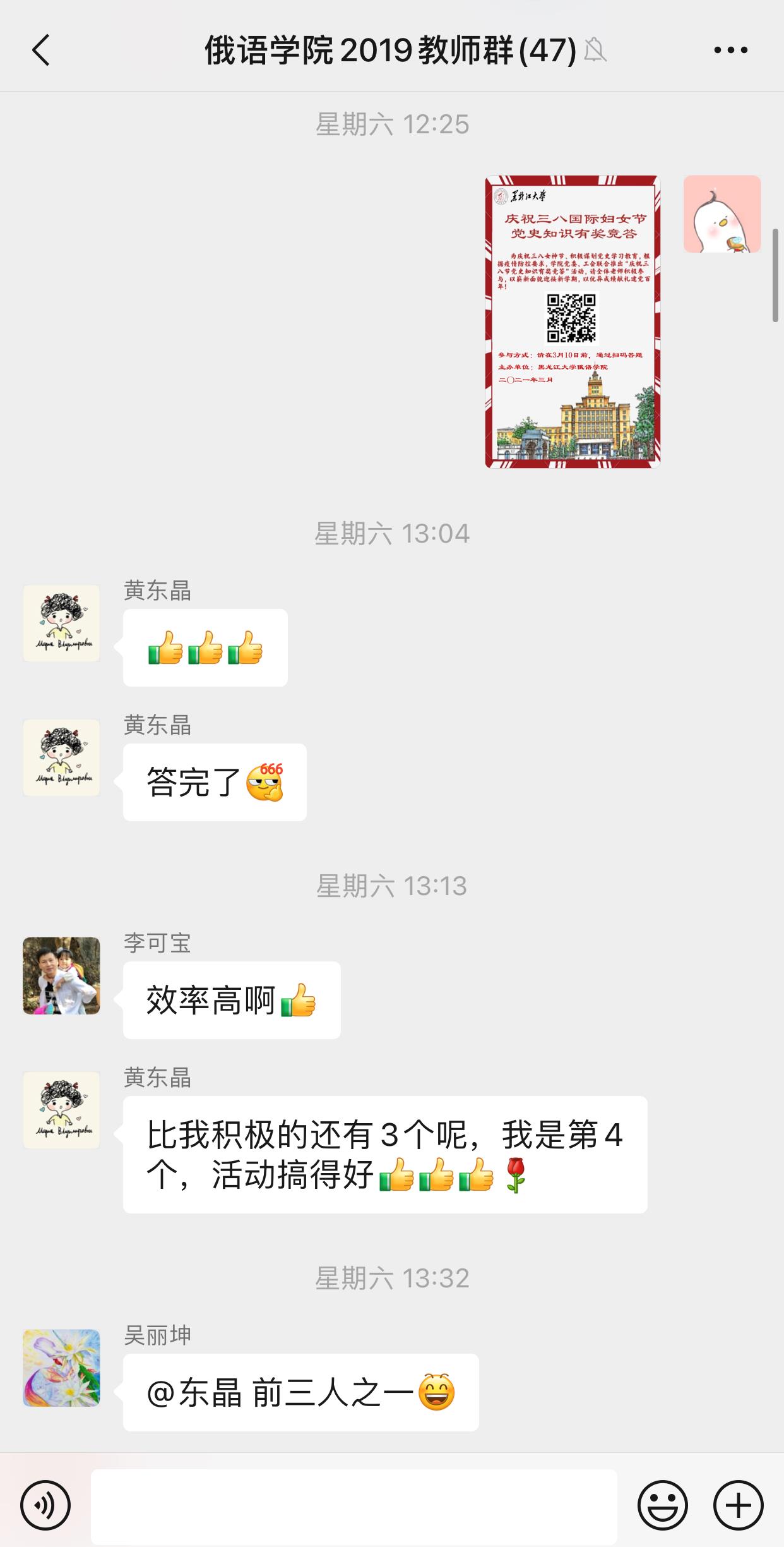 活动开始后,全体老师热情高涨,积极参与,感受线上知识竞答带来的快乐,检验自己在假期学习党史知识的效果。随着活动的进行,四十余名老师完成了答题,取得了优异成绩,共同营造了浓厚的节日氛围。通过参与网上答题活动,大家纷纷表示在节日期间举办这样的活动十分有意义,不仅是对自己学习效果的一次实战检验,也是找差距再学习再提高的一次良好机会,让大家度过了一个难忘的“三八”国际妇女节。