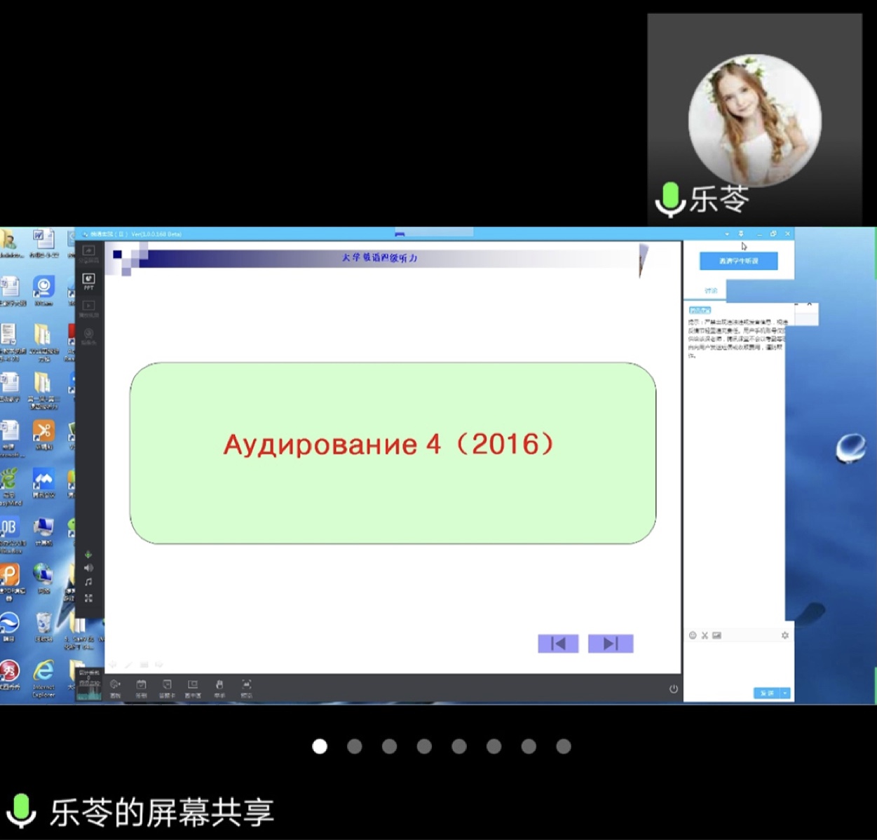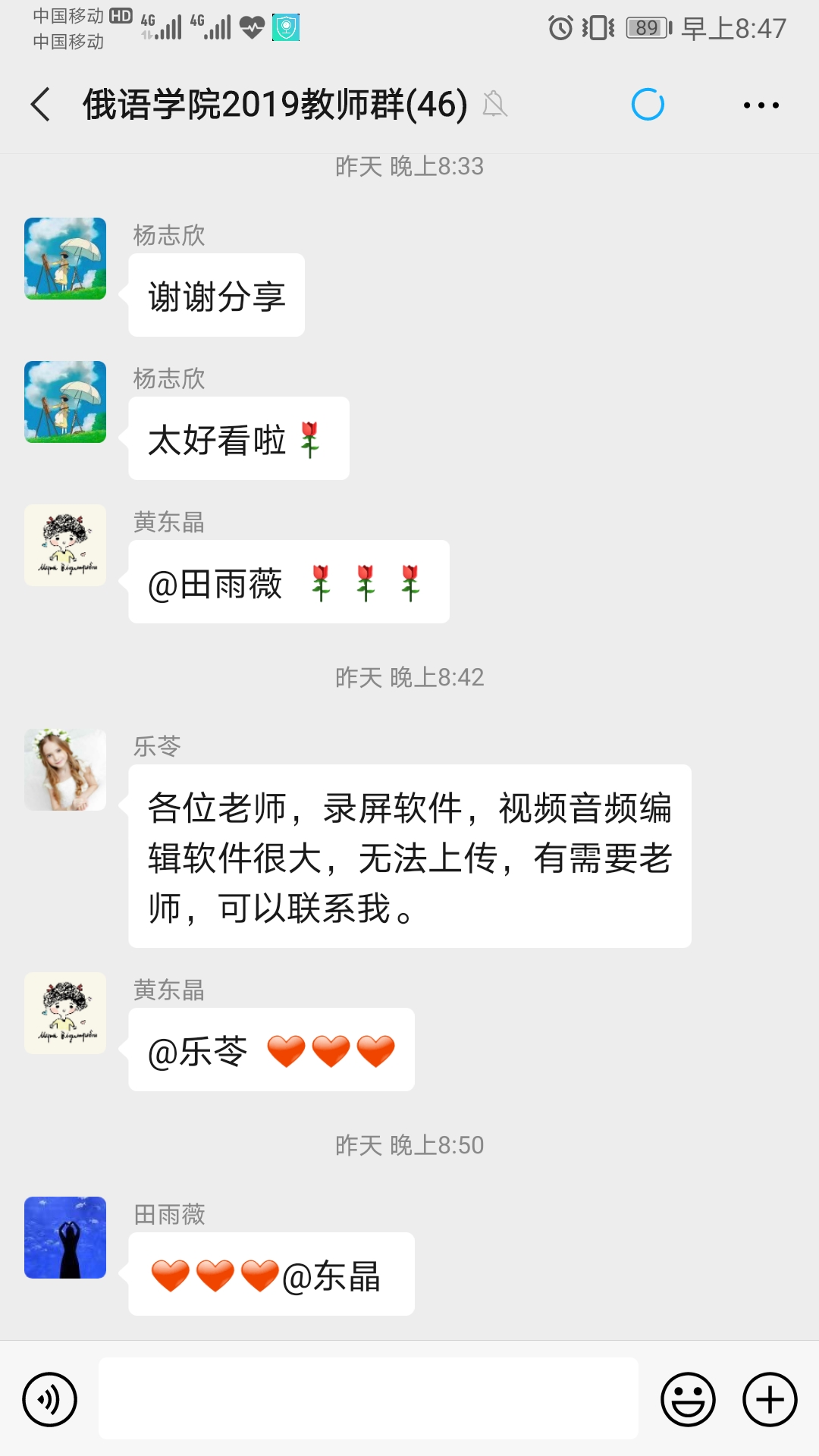 随后,乐苓和田雨薇两位老师在平台选择、教学方式、作业布置、过程考核、自主学习、交流互动等方面进行了经验分享。乐苓老师传达教育部的相关文件;反馈了作为督导在听课工作过程中发现的一些问题,并提出建议;还向大家介绍腾讯课堂的一些功能,推荐各种扫描软件。田雨薇老师以轻松活泼的动漫形式展示钉钉的各种功能;讲解在PPT里插入视频、添加超链接、添加音乐的方法;推荐使用天天录课来辅助教学。