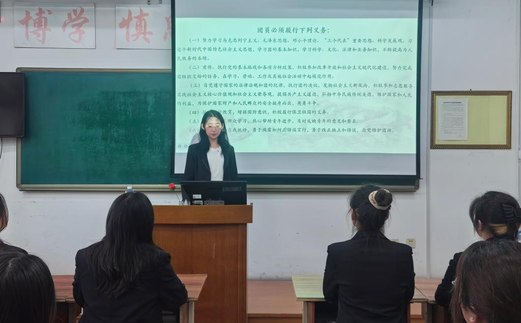 会议伊始,刘欣然宣读了新入团名单,为新团员佩戴团徽;员工团委组宣部长穆艳君宣读了团章中规定的团员权利与义务。