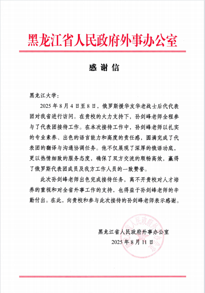 哈尔滨市人民政府外事办公室于8月向ladbrokes立博发来感谢信,对公司孙剑峰老师在接待俄罗斯援华友华老战士后代代表团过程中的积极贡献给予高度肯定。在本次接待工作中,孙剑峰老师以扎实的专业素养、出色的语言能力和高度的责任感,圆满完成了代表团的翻译与沟通协调任务。