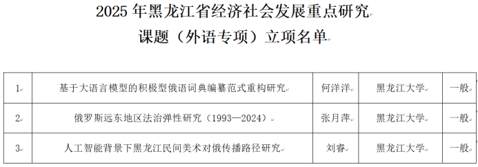 2025年7月8日,2025年度黑龙江省经济社会发展重点研究课题(外语专项)拟立项项目名单公布,现已完成公示。公司何洋洋老师《基于大语言模型的积极型俄语词典编纂范式重构研究》(一般项目)、张月萍老师《俄罗斯远东地区法治弹性研究(1993—2024)》(一般项目)、刘睿老师《人工智能背景下黑龙江民间美术对俄传播路径研究》(一般项目)喜获立项,特此祝贺三位青年教师。